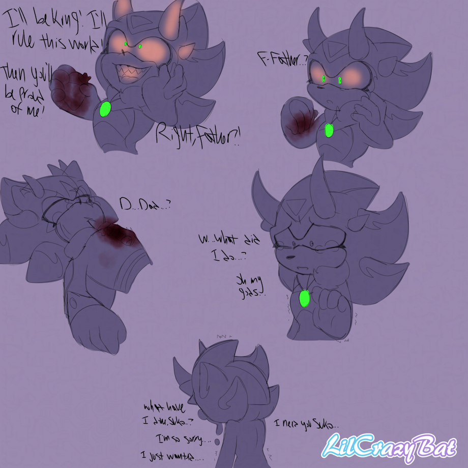 Doom wasn't a perfect father but he was a single dad doing everything. So he prioritized on the son that's more important to the future. He didn't care what happened to Mephiles. He had to get him in trouble and sadly Sukos mother was at the right place at the wrong time. Does Shadow feel bad? Maybe. But it worked. So he didn't care. His rings have been improved since "Flowe" but he learned how to remove them. He keeps them updated but he often doesn't care about them. So he gets violent outbursts. His shard is getting messy now holding more power that's not his So the rings basically don't even work most days. Now that he's on his own he can say whatever that works. And luckily Sukos young. Still a childs mind that can be molded. Technically this was supposed to be the last part of the past but you reminded me I should do a follow up of the new arrangement. Wonder how Suko feels about all this. Thank goodness the elders are watching over him.