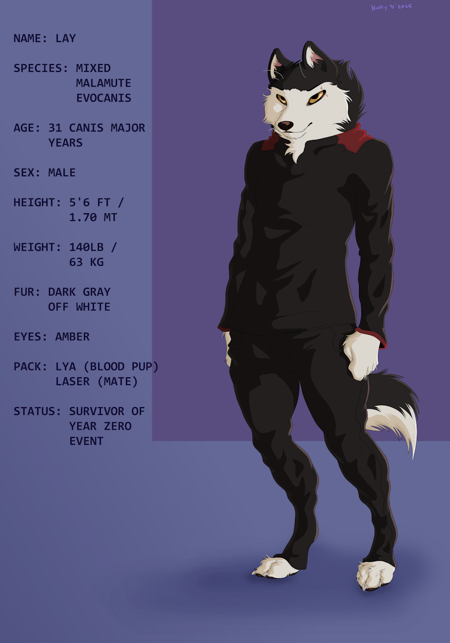 His past is not without scars. His former pack was lost in the Year Zero Event. His mate and both of their pups. Despite the painful memories, Laser never lost his will to live and work hard for Canis Major and his kind. During that horrible day, he met a younger Lay (story pending), and formed a little pack of their own. Laser, Lay and Lay's daughter, Lya.