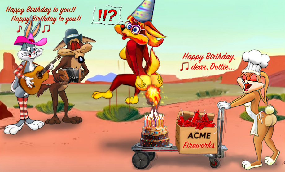 Last month, Dottie Coyote had a birthday, and her friends threw a party in which Lola Bunny proved she knew more that one way to bake a cake. Bugs Bunny, Wile E. Coyote and Lola Bunny are property of Warner Bros. and their affiliates. Dottie Coyote is me.