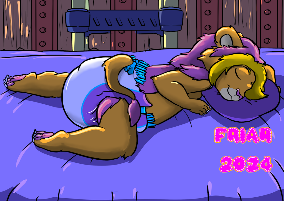 Illustration of Friar the wet and messy diapered lion snuggling a pillow and sleeping on his side in his crib.