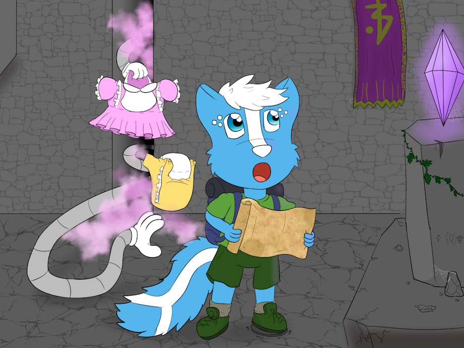 As the skunk heads inside, he kept observing everything about the temple, the walls, the flags around from a civilization no one seems to ever heard about, and as he got inside, he saw the biggest prize... a big pink crystal.