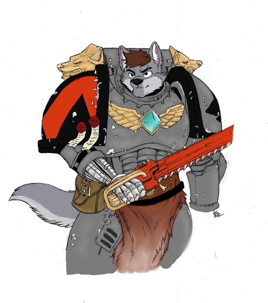 Since I started playing Warhammer 40k and being a furry I wanted to have a pic of my fursona as a space wolf. Jorun is a grey hunter that first became a short time ago a grey hunter. He lost his right lower arm and hand in a battle as he saved the live of his lord. He got a bionic implant instead of his lost arm. Jorun uses a frostblade, bolter and boltpistole.