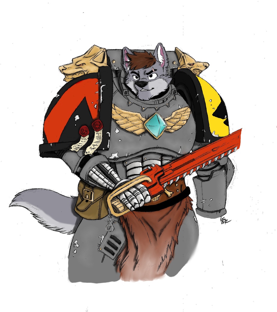 Since I started playing Warhammer 40k and being a furry I wanted to have a pic of my fursona as a space wolf. Jorun is a grey hunter that first became a short time ago a grey hunter. He lost his right lower arm and hand in a battle as he saved the live of his lord. He got a bionic implant instead of his lost arm. Jorun uses a frostblade, bolter and boltpistole.