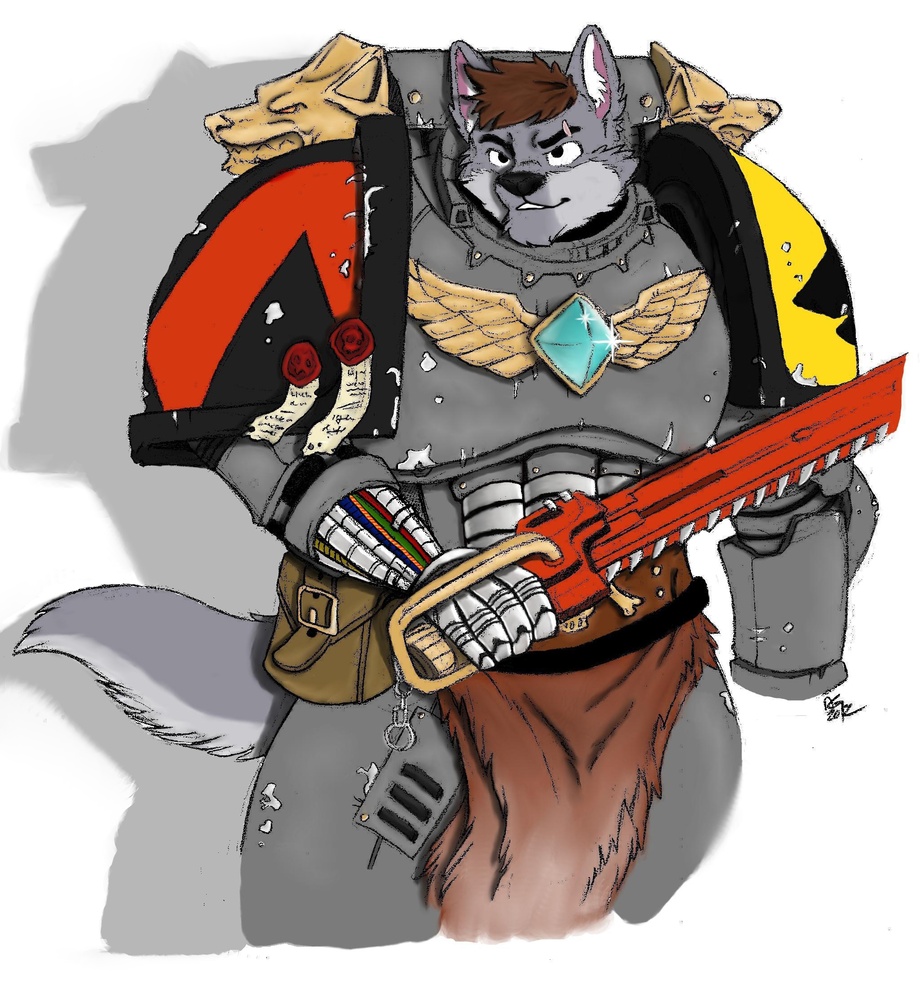 Since I started playing Warhammer 40k and being a furry I wanted to have a pic of my fursona as a space wolf. Jorun is a grey hunter that first became a short time ago a grey hunter. He lost his right lower arm and hand in a battle as he saved the live of his lord. He got a bionic implant instead of his lost arm. Jorun uses a frostblade, bolter and boltpistole.