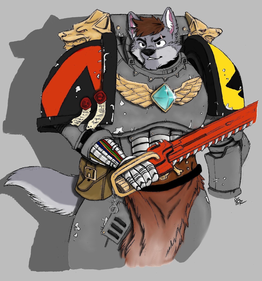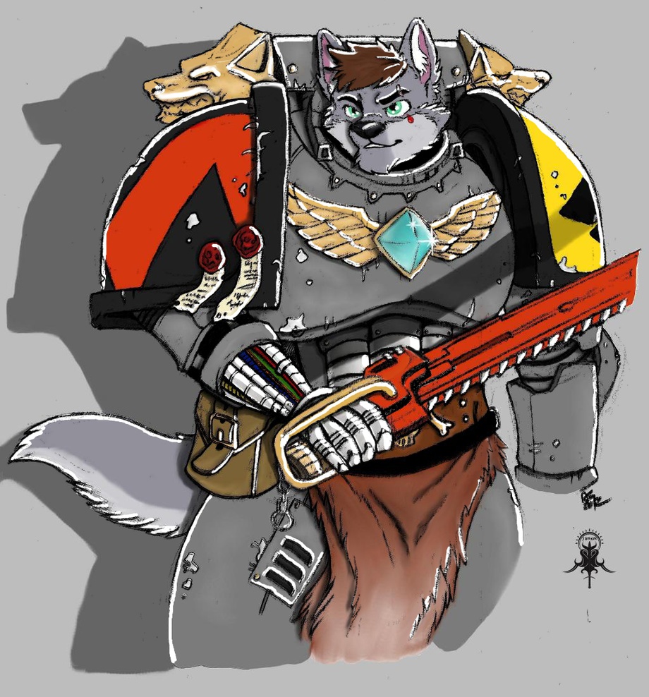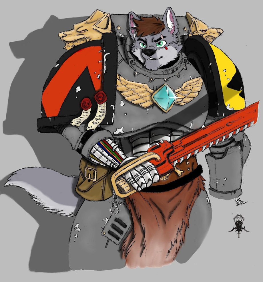 Since I started playing Warhammer 40k and being a furry I wanted to have a pic of my fursona as a space wolf. Jorun is a grey hunter that first became a short time ago a grey hunter. He lost his right lower arm and hand in a battle as he saved the live of his lord. He got a bionic implant instead of his lost arm. Jorun uses a frostblade, bolter and boltpistole.
