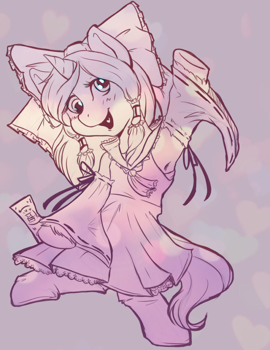 This is some gift art from an old friend who is no longer really around. My pony OC, Pembroke, (pem for short) is honestly a changeling who assembles her looks from individuals she encounters that have features she just thinks are neat. Here we see her cosplaying a character from a certain bullet hell series I enjoy.