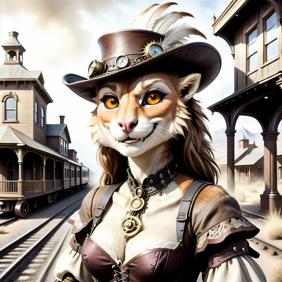 <lora:DonMDr4g0nXL-v2rb:1>,DonMDr4g0nXL,<lora:DetailedEyes_V3:1>, <lora:neg4all_bdsqlsz_xl_VC9:1>, <lora:add-detail-xl:1>,perfect lighting,masterpiece,best quality,incredible detail,male __Species/taur__,, Senior, Chiseled, Chestnut eyes, Square Chin, Defined Cheeks, Low Forehead, Square face shape with Angular Jaw, Natural everyday makeup , Ginger Pompadour hair, Worry , wearing a steampunk attire, Velveteen corset with brass embellishments, flounced skirt with chainmail trim, feathered fascinator, lace-up Victorian heels, Gear-adorned monocle with adjustable lenses,portrait, looking up, focus on Character, solo, upper body, detailed face, ( sinister, (DarkFantasy:0.8), <lora:EnvyBiophilicXL01:1.0>, <lora:EnvyCuteXL01:1.0>, theme:1.1), sheriff, wide brimmed hat, holster, coat, necklace, dynamic movement, evil smile, 19th century wild west, american frontier, wild west era empty town with railway station in background, epic atmosphere, arid,,<lora:Furry Enhancer V2.84:1.0>