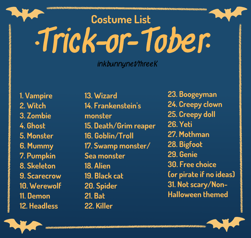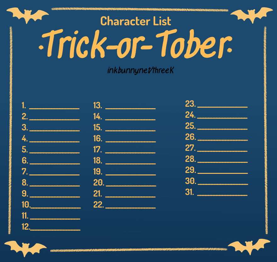 well... if you saw my last journal, you'll know i was really hoping to find something to do this october, but found nothing interesting, so here's my own inktober alternative: Trick-or-Tober! the premise is you draw a character trick or treating for each day of october!