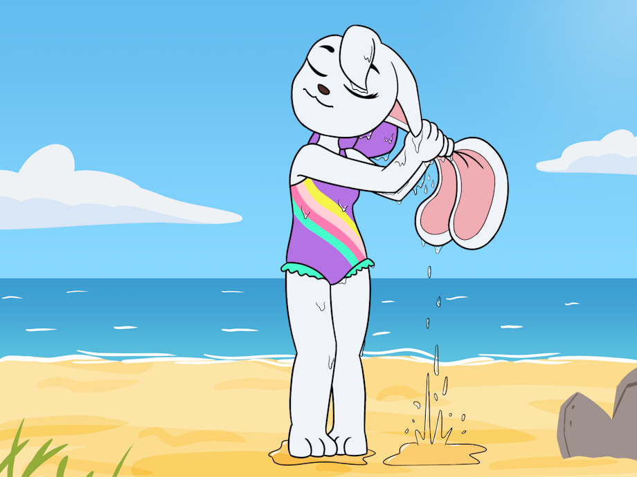 I wanted to draw Pon Pon wearing her one-piece swimsuit, but also got the silly idea of her wringing out her ears, so this is how it ended up like.