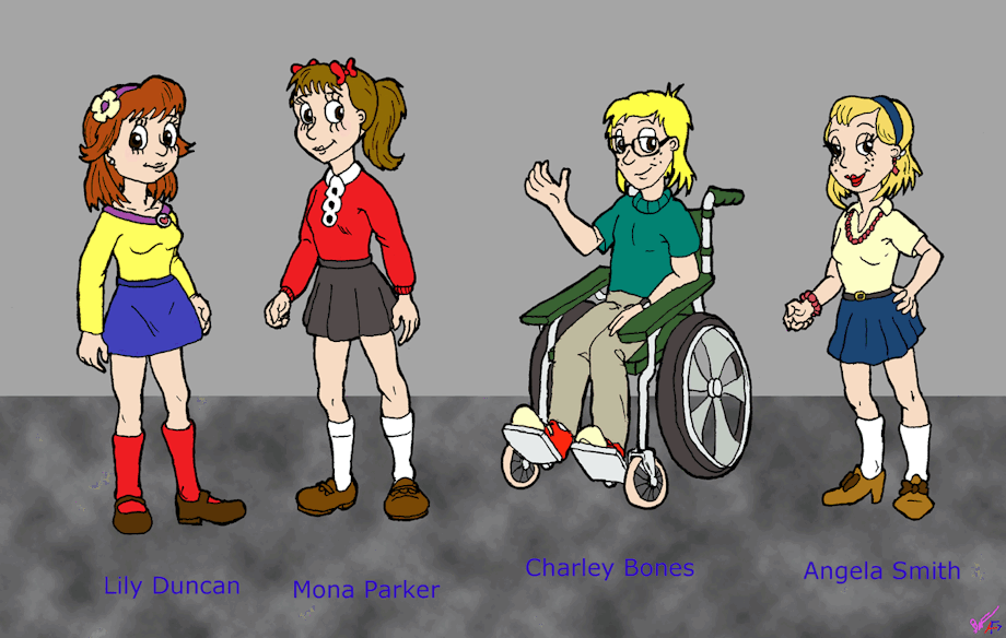 Mona was the leader, becoming, with the help of a bad wig and a cape, Mona the Vampire! Lily was the quiet one who, wearing high heals, a blond wing and a crown, would become Princess Giant. Charley would put on a superhero-ish costume, picked up a super soaker (his Zap Ray) to become Zapman. Angela is the Nuevo rich, snobby foil for Mona and her friends.