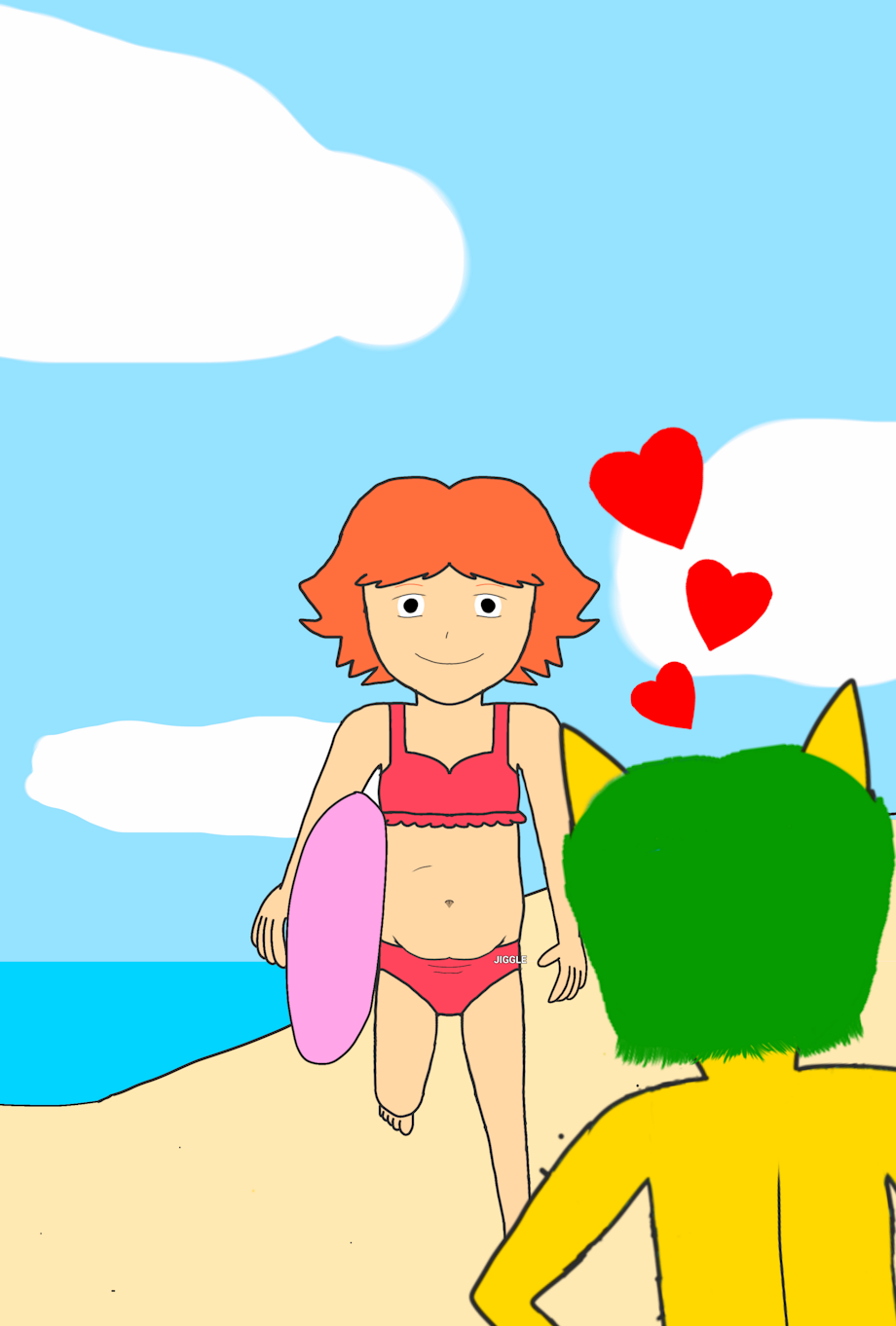 This was when Mikey met Ponyo and Dora at the beach. They said hello to each other, Ponyo patted Mikey's head and became friends and they did a little belly dance and gave him a big hug!