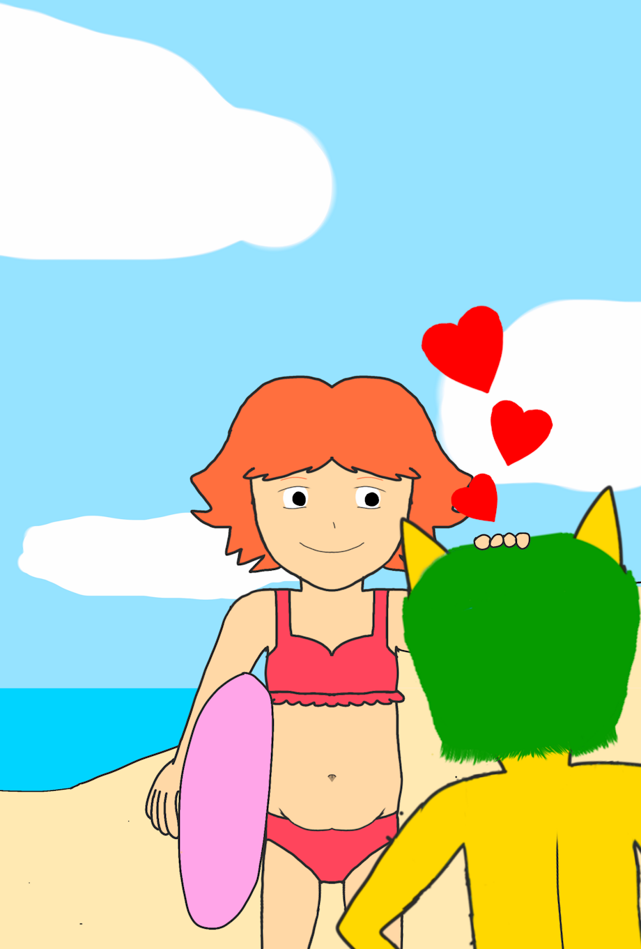 This was when Mikey met Ponyo and Dora at the beach. They said hello to each other, Ponyo patted Mikey's head and became friends and they did a little belly dance and gave him a big hug!