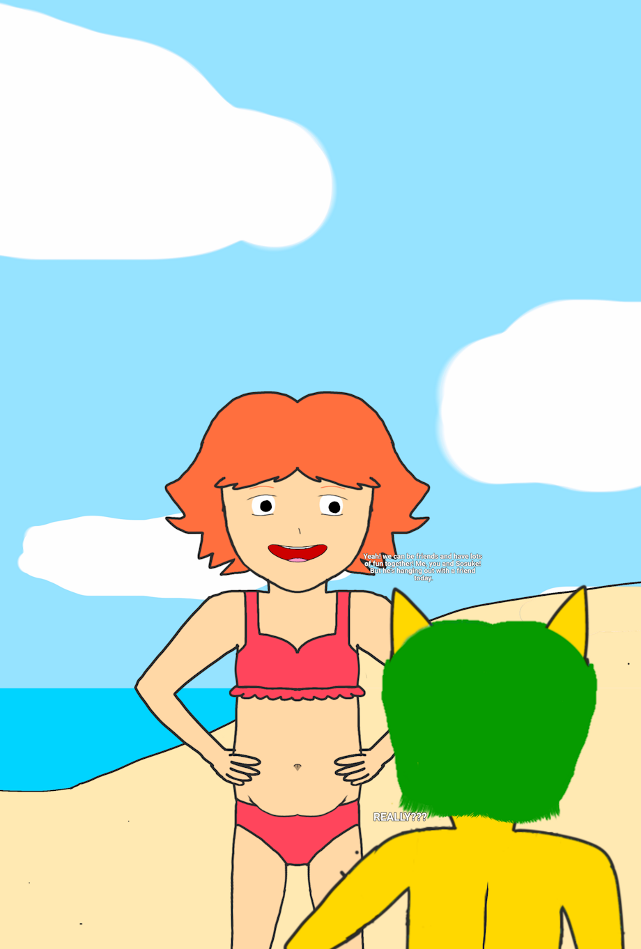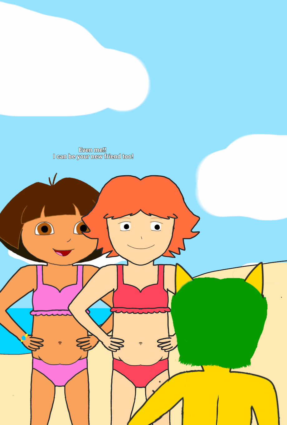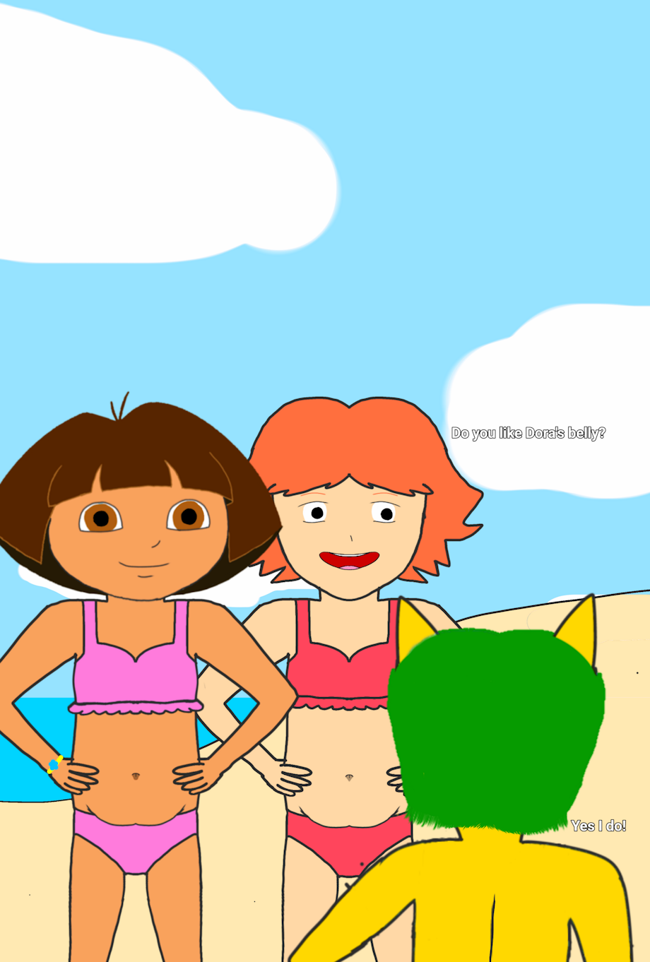 This was when Mikey met Ponyo and Dora at the beach. They said hello to each other, Ponyo patted Mikey's head and became friends and they did a little belly dance and gave him a big hug!