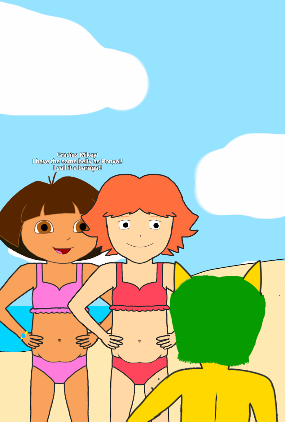 This was when Mikey met Ponyo and Dora at the beach. They said hello to each other, Ponyo patted Mikey's head and became friends and they did a little belly dance and gave him a big hug!