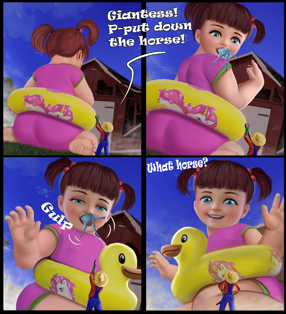 This piece has a bit of a complicated history, and I think that the character will go through more changes before she is finished. She is based on the giantess in a Goldfish commercial, I linked it below. A friend of mine at the time shared the video and we were off to the races. lol This same friend wrote a story based around the personality that had formed. This is actually part of one of the scenes in the story, and is perhaps one of this author's best pieces I've ever read. While I do not know how comfortable that user is with me sharing their info here, I can say that they did post about it. If I receive confirmation of it being okay I will post the story here. I DID receive permission to share it elsewhere so it may eventually be posted to my Mastodon account.