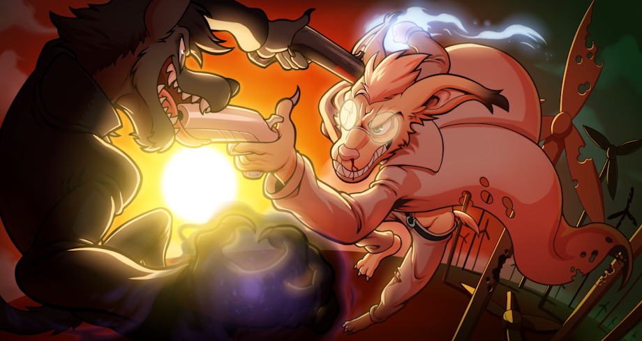 Oz and Wrath are two of the most powerful individuals in all of Artsoma Verge. Oz, a dark wolf born under the Dark Sun, granted the powers of the Demons and raised by Allysis, strives to protect those who are rejected and chastised. Wrath, on the other hand, a Lynx holyman who heads the religious zealots, the Followers of Light, granted the powers of holy light by the Keepers, swears to cleanse the planet of evil and darkness. It's no surprise these two fight and conflict constantly, and due to the powerful abilities possessed by both that makes them near invincible, their duals can be devastating events that leave destruction and even death in their wake. These two powerful creatures are feared by many who encounter them. Surprisingly, some extreme events do cause the two to join together briefly, but as seen here, they much prefer a confrontation of a more violent nature.