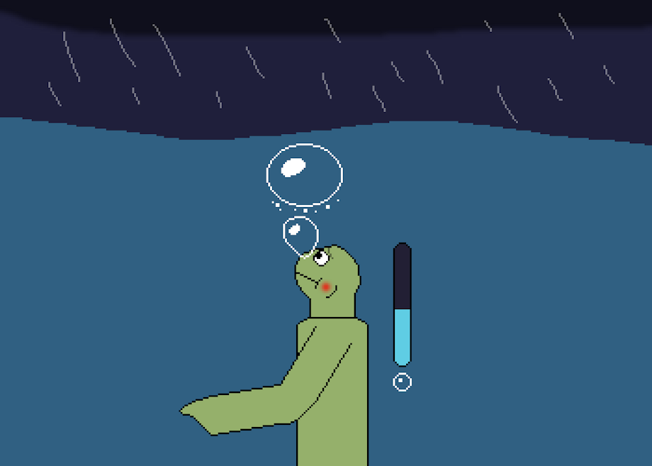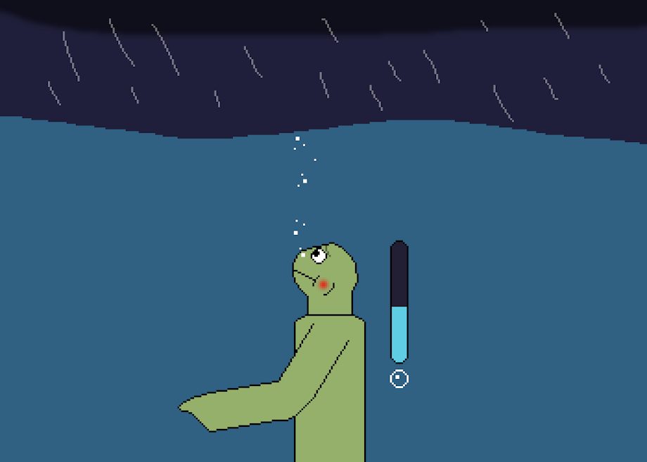 Struggling to stay on the surface during a storm he thought he could handle, the lizard gasped down a deep breath and dove under, quickly having a much easier time. But, it's been a few minutes since then, and it's occurring to him that he'll need to go back up and into the storm at some point...