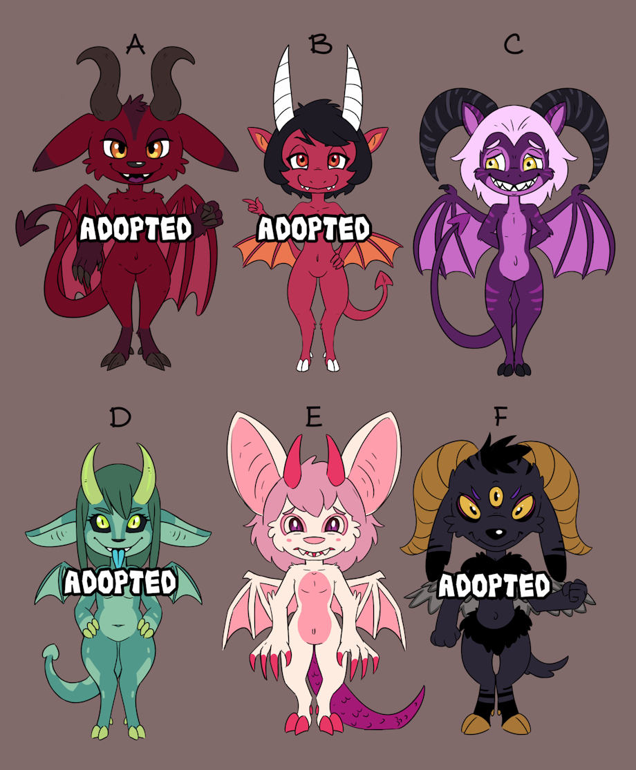 Each of these cute and slightly mischievous imps are looking for someone to take care of them. Your $55 adoption license fee allows you to take one home, choose a gender (i will add genitals) and i will design a character sheet with a custom outfit of your choice for them as a FREE bonus!