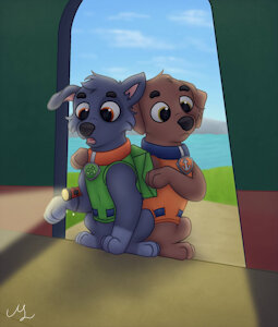 ``It's no problem!'' Rocky exclaimed, though he and Zuma weren't really doing much but standing by. He'd offer to help clean the boat if it wasn't an active crime scene. Zuma leaned against the mixed breed, not feeling very helpful in the situation. It's something he's been feeling more often lately. Still, he kept a smile on his face. Hoping to brighten the captain's mood. That's when they noticed Ryder and Chase walking back towards them.