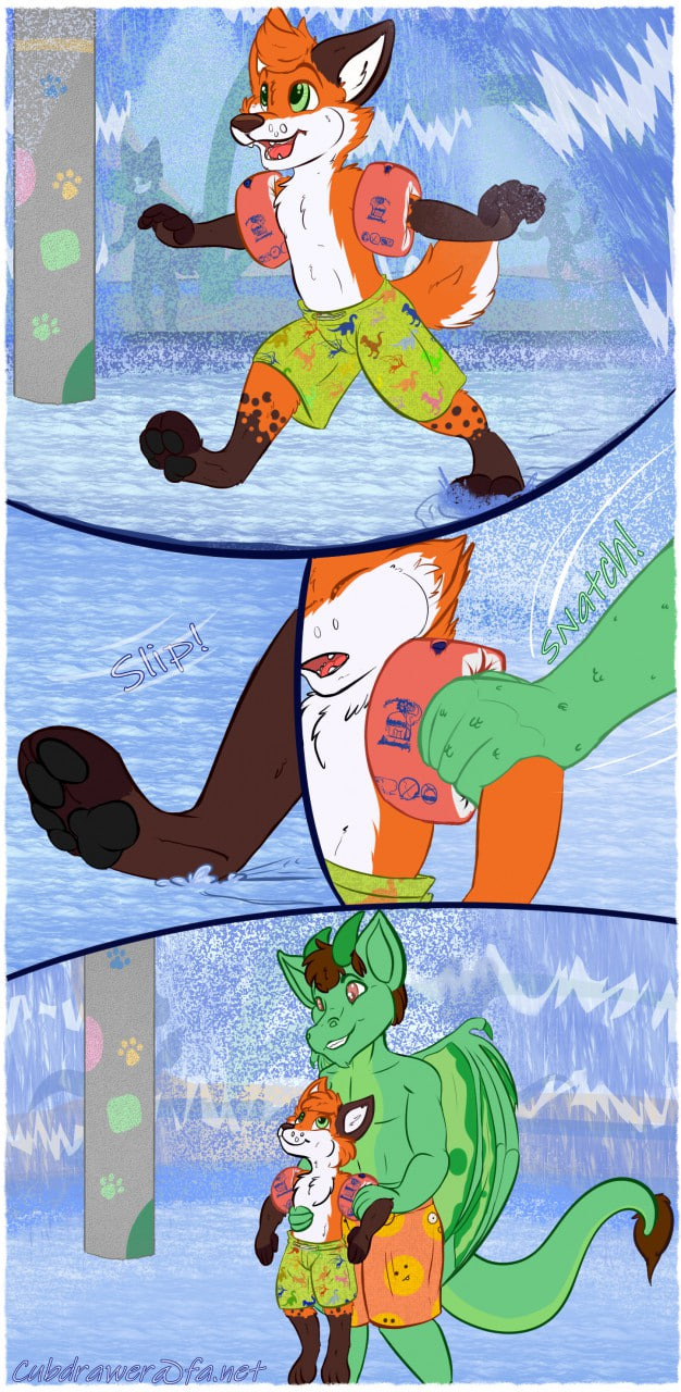 Jaberwocky is having a blast at his favorite water park with Tecwyn dragon who is watching over him. Good thing too because Jaberwocky tends to get carried away when having fun and doesn't pay attention to what hes doing. In this case, water tends to be slippery. Jaberwocky almost found out the hard way by landing right on his rump. But Tecwyn was right there to save the day. ^w^