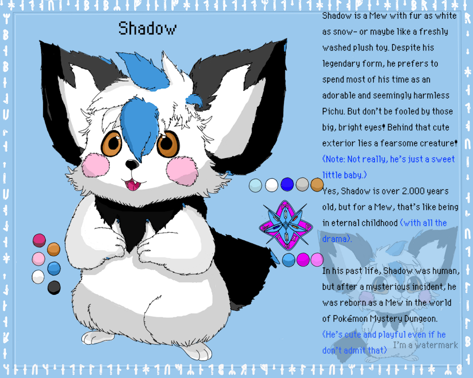 Pichu shaped but fluffy, he's white fured with blue spots.