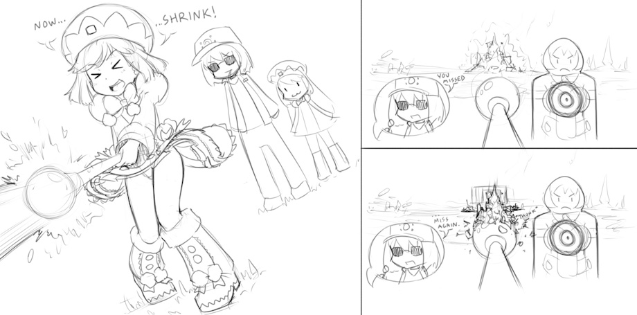 The portrayal of the magic's effects and how it plays with perspective is super cool! Seeing the entire Gamindustri Graveyard shrink down and land on her (or Flix's! Surprise cameo! ) staff is great, especially with how Leanbox is revealed behind it! I like the wide shot of how you can see the other nations from the outdoors range, it makes what's coming clear even in the second panel!