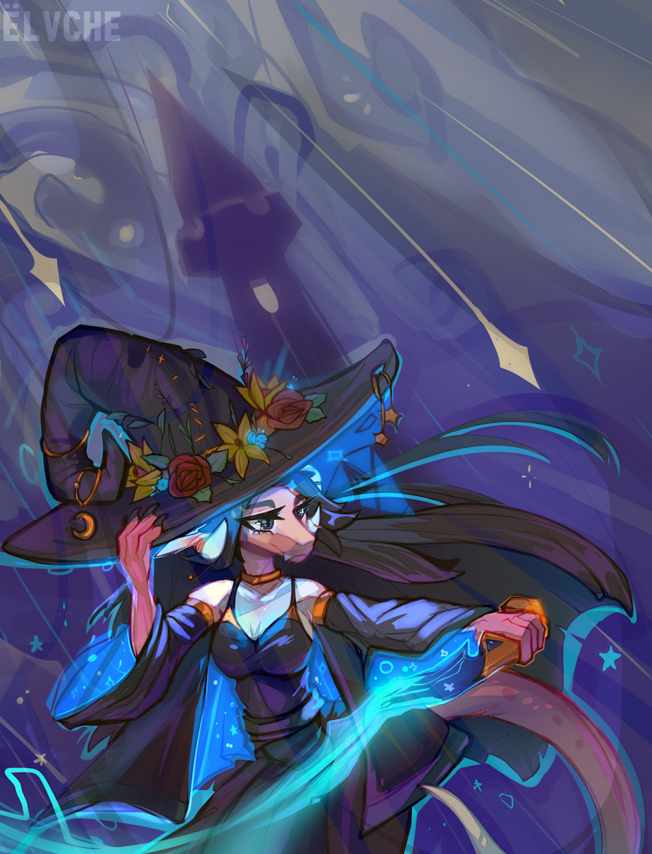 'es girl Roslyn, casting some kind of magic meteor spell, or astral missile, wilding her signature dagger :3