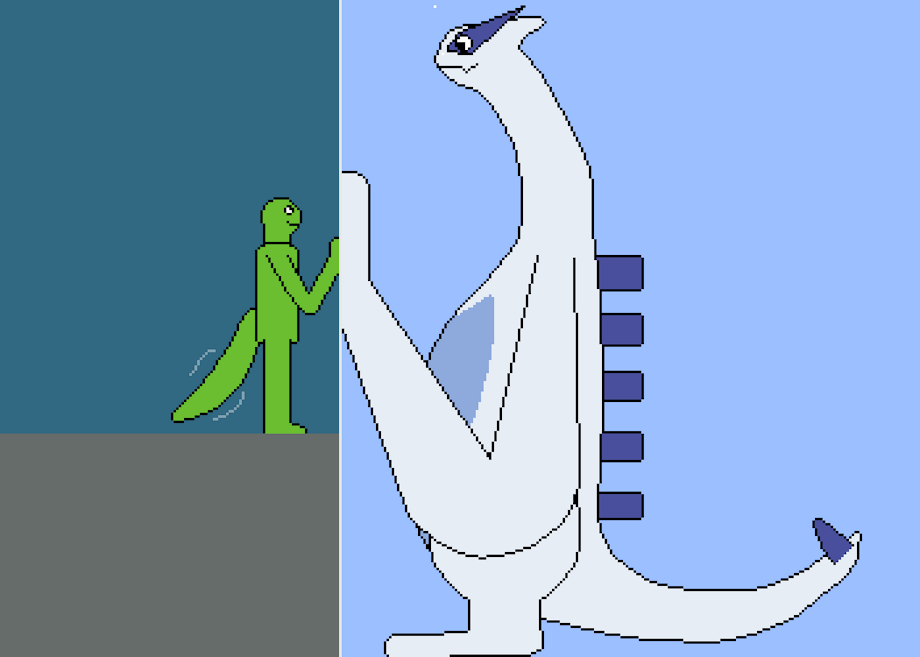 When he'd heard his favorite Pokemon would be making a guest appearance at a nearby aquarium for Lugia Day, this lizard practically couldn't NOT go see them! From the moment he first saw Lugia there, he was continually wagging his tail in excitement, watching them the whole time... There was a raffle running to see who would get to swim with them later, and he REALLY hoped he'd win - it would make this already great day WAY better!