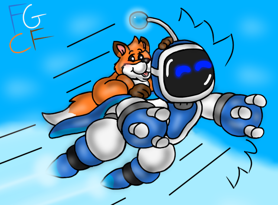 featuring his cute lil Bean fox Mike riding on the back of Astro Bot^^.