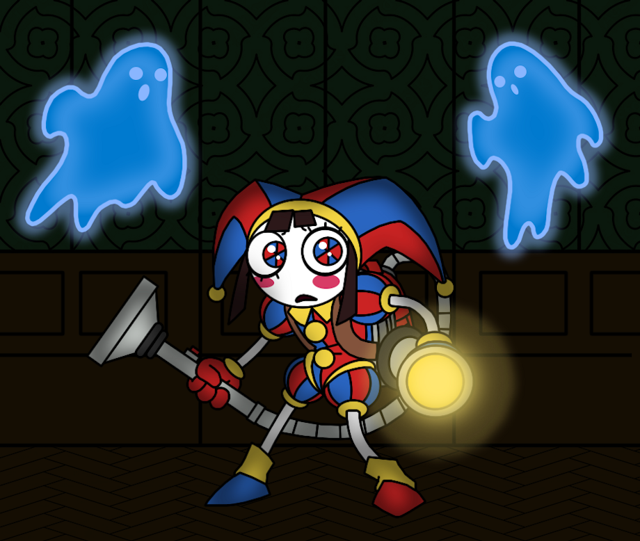 What better way to start the month than with a picture combining this concept with one of my all-time favorite Gamecube games, Luigi's Mansion, as we have the ever-so timid and anxious jester, Pomni, traversing inside a haunted mansion, wielding Professor E. Gadd's famous Poltergust 3000. Looks like she's already got company...