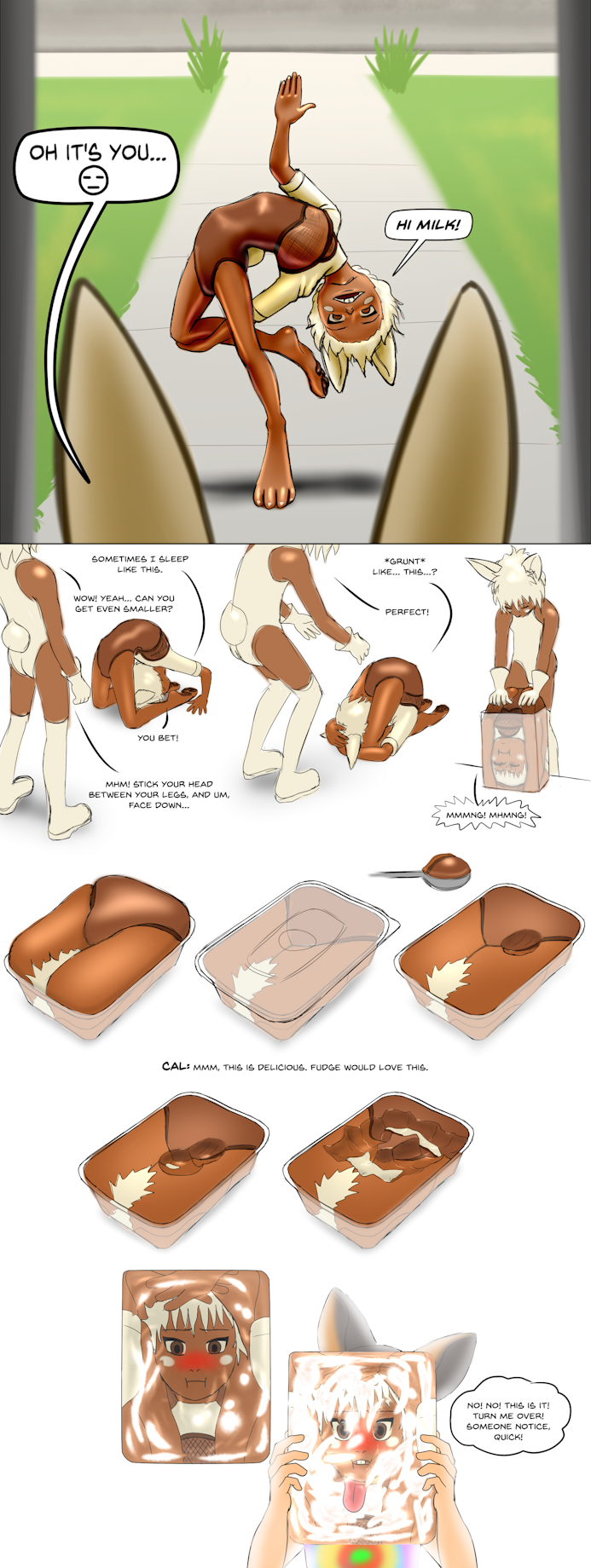 Milk get's a visit from an annoying cousin called Fudge. (They're both made of chocolate, caramel, and fudge.) But while practicing contortion and flexibility, Milk finally gets an idea of how to get rid of his competition. After stuffing him into the container, he puts him away in the freezer, where Cal later finds him, and not realising that it's Fudge, enjoys a very tasty fudge sundae.
