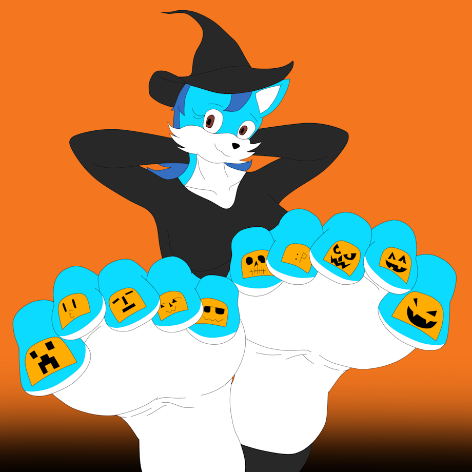 Here, we have my gal Iris the Fox as a witch showing off jack-o'-lantern designs on her toenails to get into the Halloween spirit.