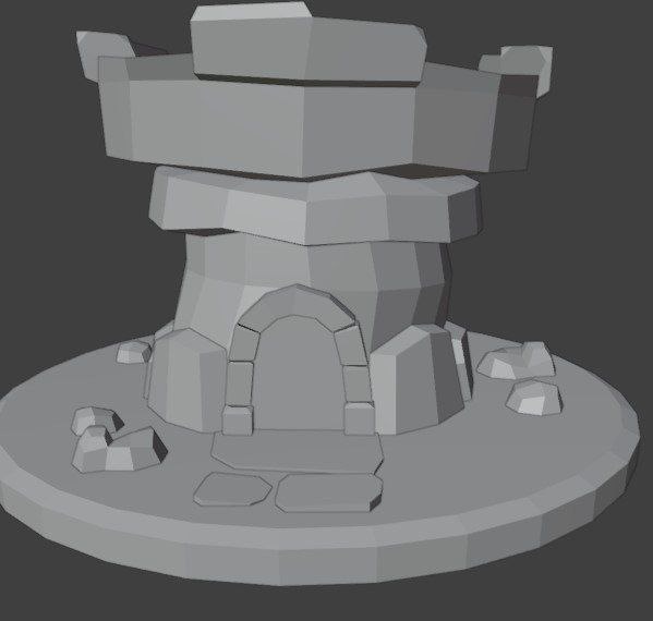 From another Gamedev.tv tutorial. Another fun low poly model. All textures painted via a tablet- not a single image texture used at all- none on the stone walkway, none on the grass, none on the stones around the door, nor the around the turret and none on the wood.
