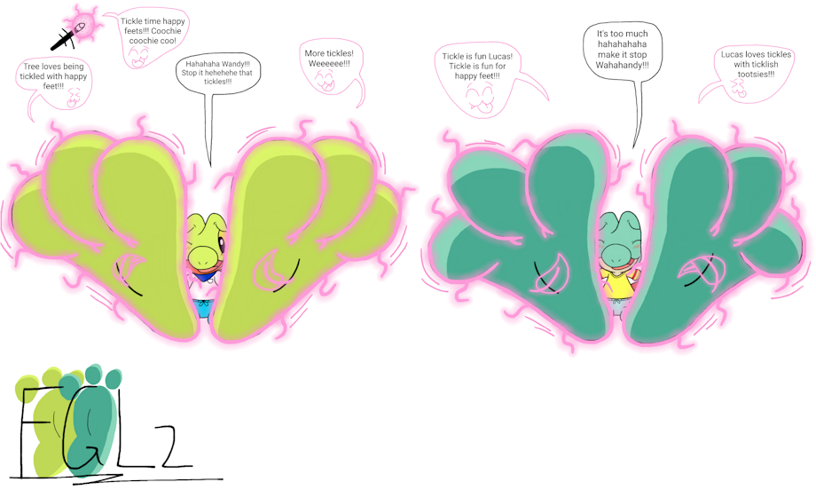 Wandy cast a another spell for getting a massage and Lucas relieved that Wandy offers a massage on their big feet. However this ain't a "massage" for the two Treeckos, it's for their big sentient happy feet then Wandy Wand spawn an four magic floating feathers fly into the big wide sweaty sole of Tree and Lucas.