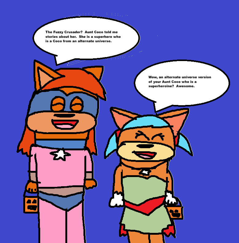 Crystal has taken Pioni trick-or-treating, and while Pioni dresses as Sweet Mint, Crystal dresses up as Fuzzy Crusader, an alternate universe version of her aunt Coco. When Pioni asks about the costume, Crystals tells her about Fuzzy Crusader and how Aunt Coco's experiments to look into alternate universes allowed her to see this heroine's feats.