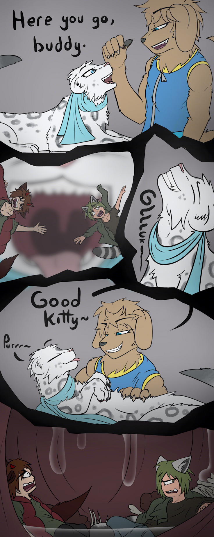 Commission for Steven, Omid and TinyAlex, as a gift for Inconnu! Featuring Omid's dog anthro self, Inco's snow leopard feral self, and Alex and Steven's snack— I mean, kemono selves!