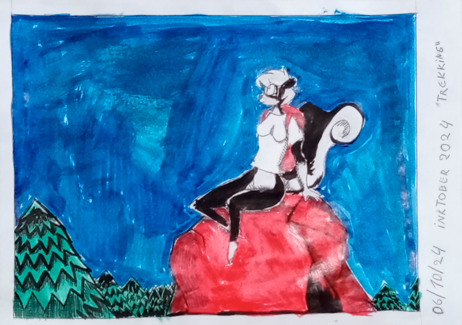 Inktober 2024 día 6 La palabra del día es Trekking o “Senderismo en español”, esta vez se me ocurrió dibujar a otros personaje que también me gusta, en este caso la Mofeta Sabrina, de las tiras de “Sabrina Online”, en este caso descansando sobre una gran roca después de hacer senderismo por una montaña.