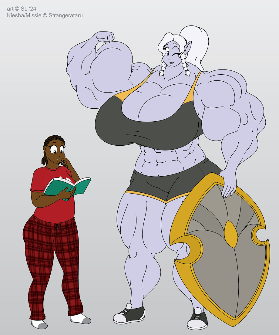 In this piece, Strangerataru just wanted something of a "before and after", featuring their fantasy aficionado Kiesha and their transformed alter-ego, the Drow-Hyde Shieldmaiden known simply as Missie.