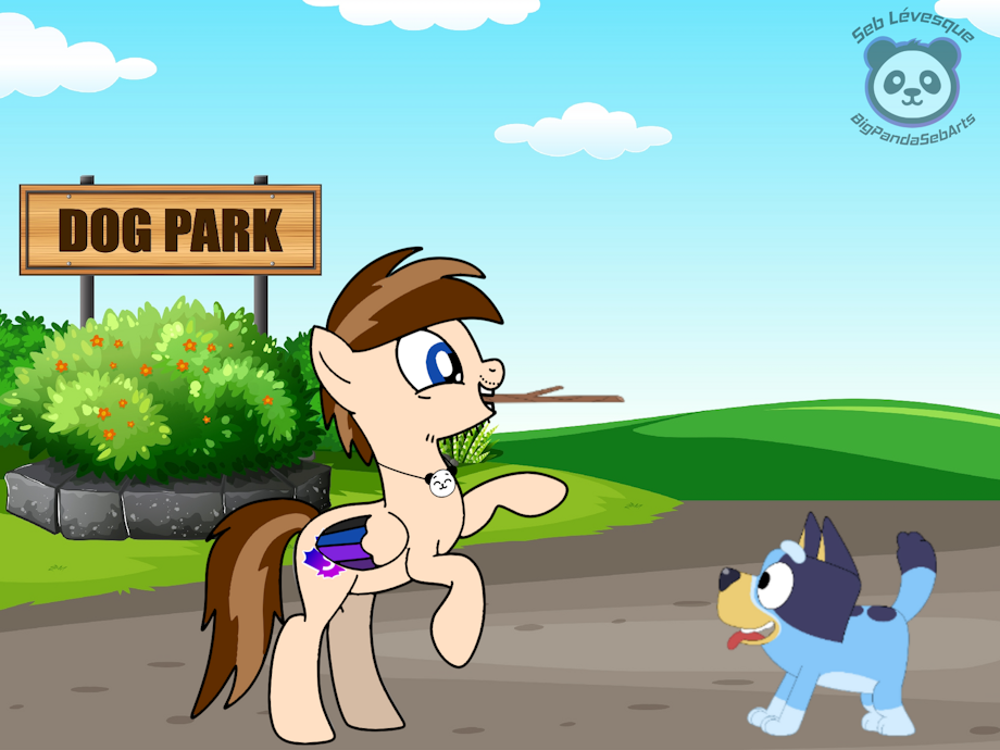 Here's a drawing I did yesterday featuring Seb the Pony, my ponysona, who plays fetch (with a stick) with Bluey. You have to admit it they loves having so much fun together.