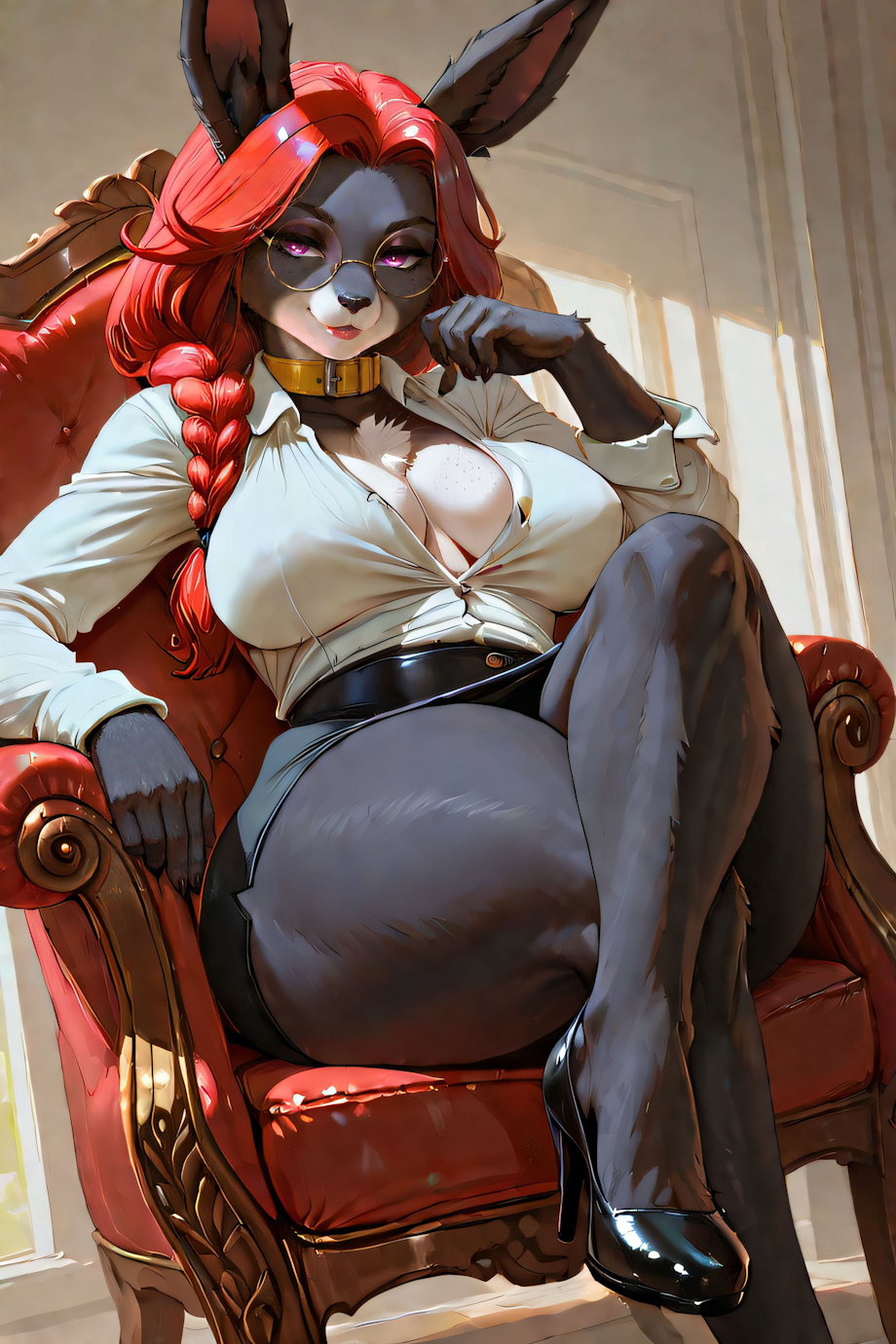 masterpiece, best quality, ultra high detail, <lora:(1) Furtastic Detailer:1> BREAK (black fur, white belly:1.5) (white button down shirt:1.4) (black skirt:1.4) (high heels:1.4) (slutty:1.5) BREAK (AS-MidAged:1.5) A (female:1) (eevee:1.3) with a (athletic:1) (gray fur:1.3) (white furry face:1.4) (white chest hair, white chest tuft, white belly:1.4) (red lips:1.4) (curvy body:1) , (huge breasts:1) (glasses, freckles:1.3) (pink nipples:1) (pink eyes with black pupils:1.3) (single braided ponytail, red hair:1.3) She wears a (yellow collar:1.3) (milf:1.5) (thick thighs:1.4) (hourglass figure, cubby:1.4) <lora:(1) Character Design Concept:1> (CharacterSheet:1), (multiple views, full body, upper body, reference sheet:1),, (clothes:1.3) Negative prompt: multiple tails, disconnected tail, boring_e621_v4, bad quality, worst quality,, bloodshot eyes, arms behind back, hands behind back, blurry, blurry background, bad anatomy, bad hands, three hands, three legs, bad arms, missing legs, missing arms, poorly drawn face, bad face, fused face, cloned face, worst face, three crus, extra crus, fused crus, worst feet, three feet, fused feet, fused thigh, three thigh, fused thigh, extra thigh, worst thigh, missing fingers, extra fingers, ugly fingers, long fingers, horn, realistic photo, extra eyes, huge eyes, 2girl, amputation, disconnected limbs, worst quality, normal quality, low quality, low res, blurry, text, watermark, logo, banner, extra digits, cropped, jpeg artifacts, signature, username, error, sketch ,duplicate, ugly, monochrome, horror, geometry, mutation, disgusting, jpeg artifacts, bad quality, jpg artifacts,badhandv4, easynegative, (brown fur:1.6), (nipples, nude, nudity:1.9) (erect nipples:1.5) Steps: 35, Sampler: Euler a, CFG scale: 7, Seed: 581216320, Size: 1152x768, Model hash: 11418ef90f, Model: yiffymix_v43, VAE hash: 24e650297c, VAE: furception_vae_1-0.safetensors, Variation seed: 2375485363, Variation seed strength: 0.79, Denoising strength: 0.41, Mask blur: 4, Lora hashes: "(1) Furtastic Detailer: 2e94914f676c, (1) Character Design Concept: 6f65857a23ad", Version: v1.6.0 postprocessing Postprocess upscale by: 4, Postprocess upscaler: 4xUltrasharp_4xUltrasharpV10.pth extras Postprocess upscale by: 4, Postprocess upscaler: 4xUltrasharp_4xUltrasharpV10.pth |