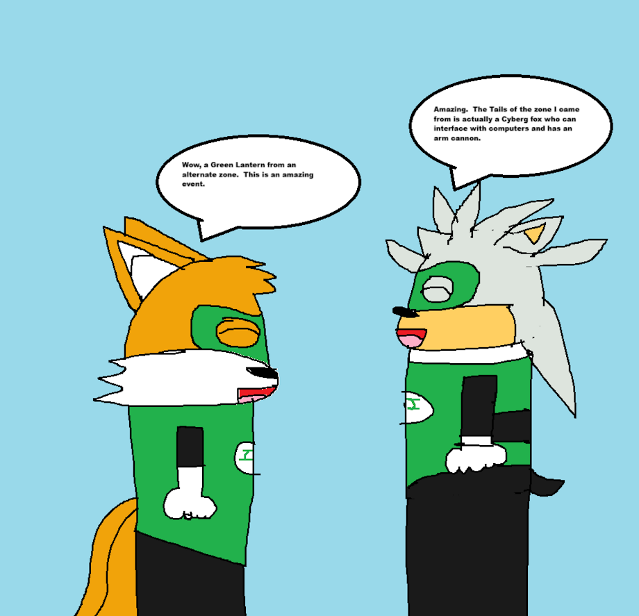 Green Lantern Tails, from one of my headcanons, meeting Green Lantern Silver, who is the Green Lantern of the upcoming Sonic X DC collab.