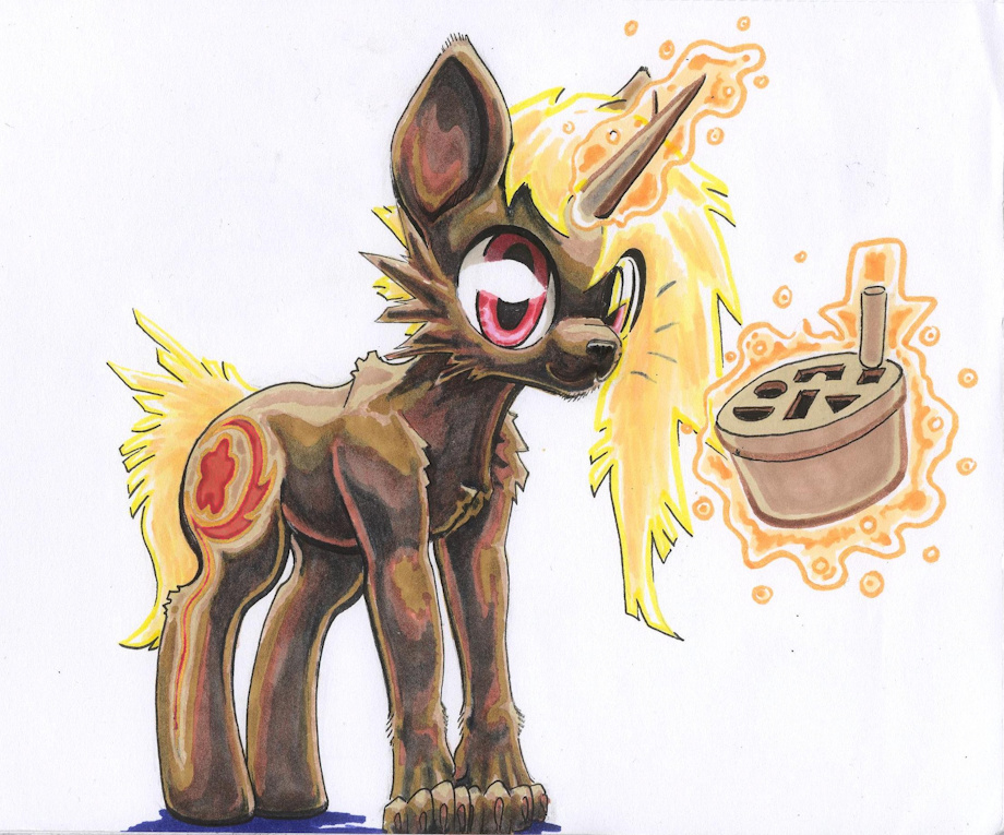 Hand drawn unicorn dog using telekinesis to put the cylindrical object into the square hole of a shape sorting bucket