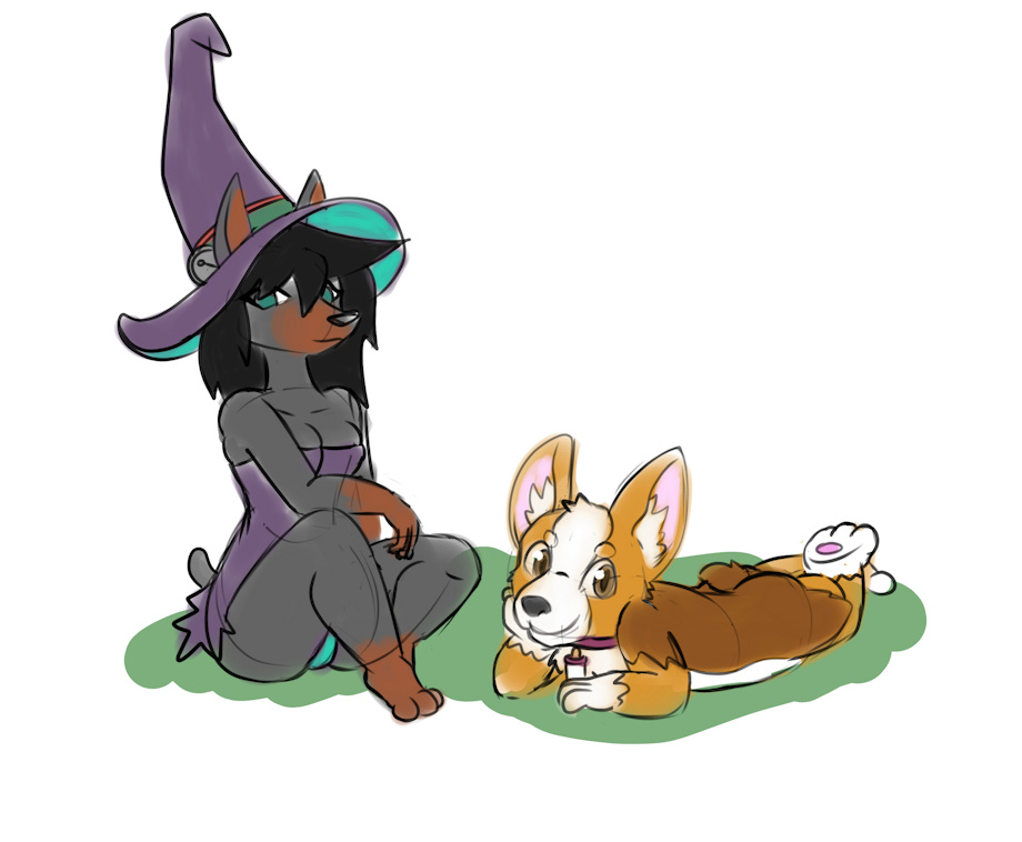Lovely sketch showing off my corgi butt, much to the awkwardness of the witch next to me.