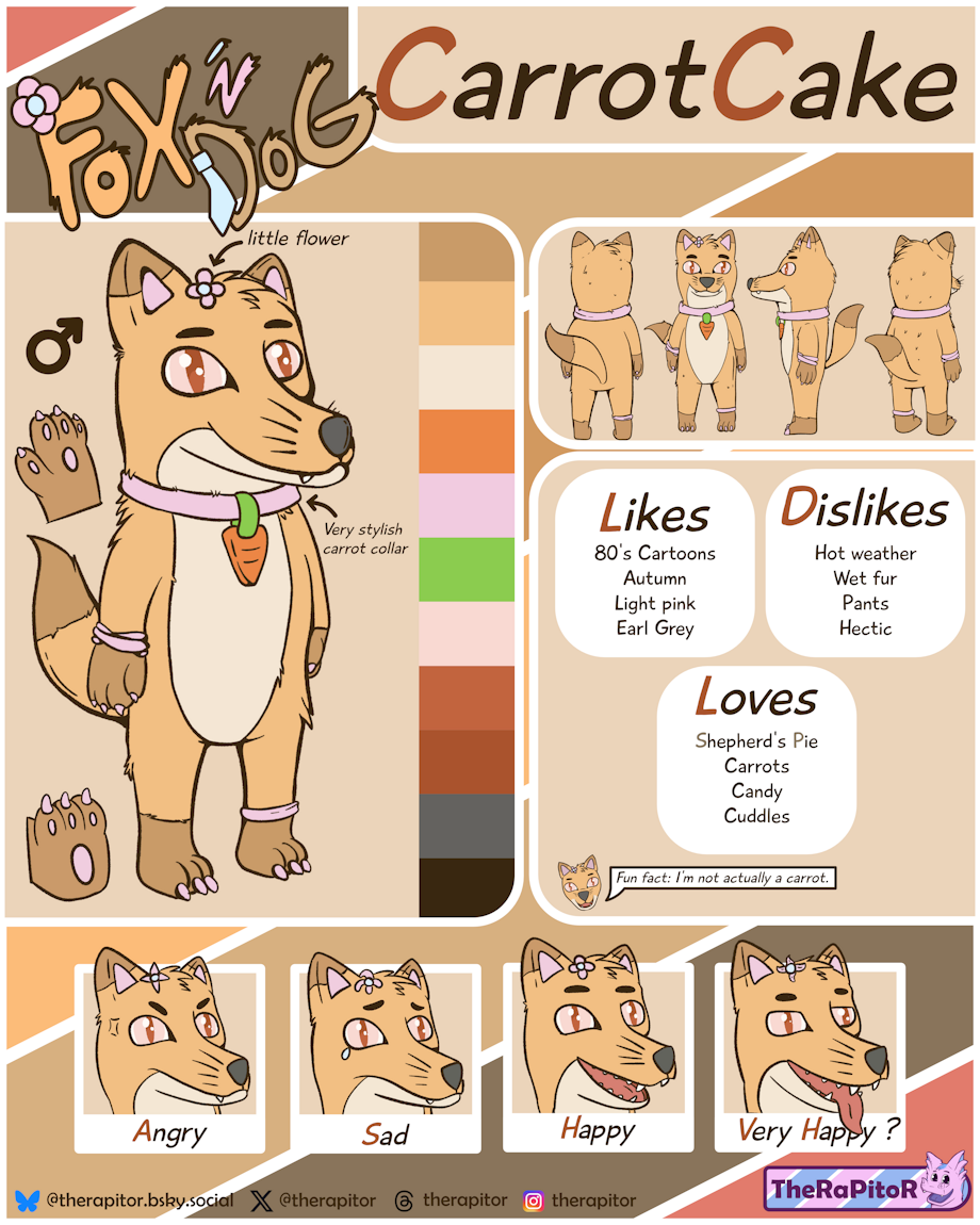 Fox'n Dog. Carrot Cake and Shepherd's Pie reference sheet