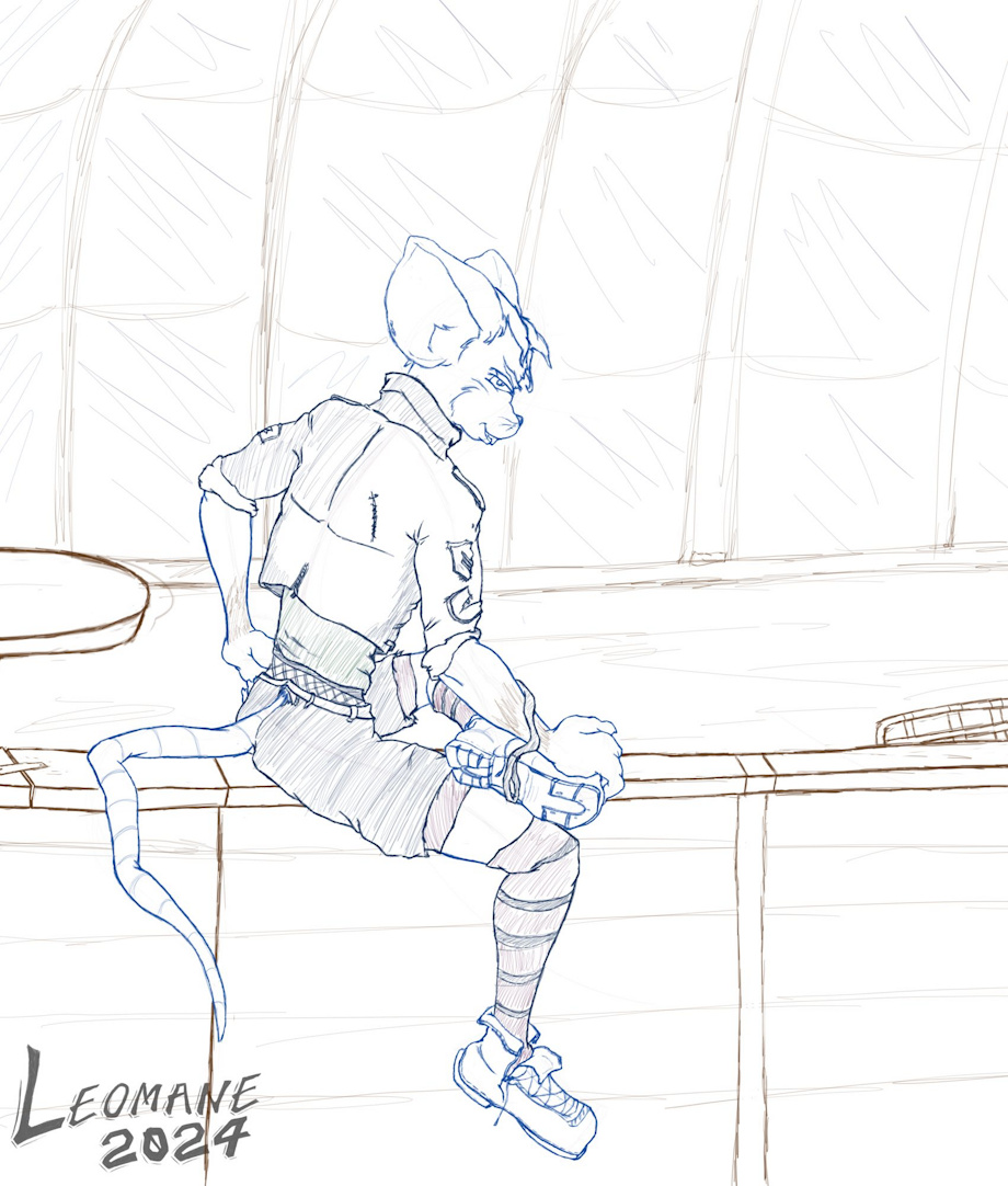 Most people know the drill by now but yeah say hello to another deliberately kinky character made during an RP session. This here is Shaw a “twinkish” punk-esque mouse with a bit of an edge who just happens to work as... well an escort and this was 100% the actual meeting scene that me 'n Danji played out ( with one other person removed as still needing to better his design up ) but yeah wandered over to the hotel and here Shaw was sitting on the fence giving that same smug look back.