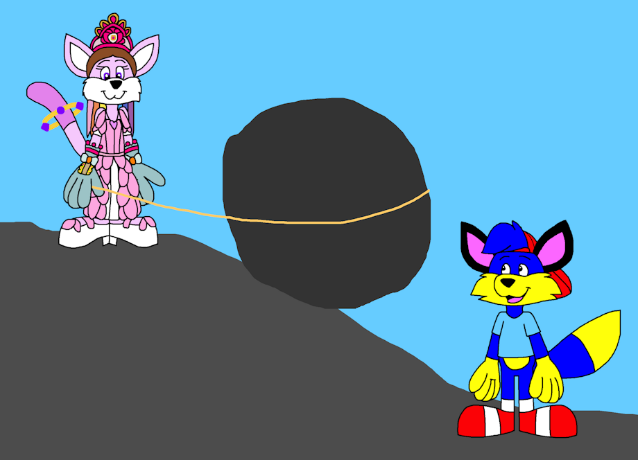 Alex the Fox See Prim Saphir Pulling a Rope with a Big Rock in the Mountain Like a Big Crisis.