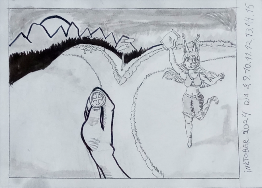 decidí hacer otro dibujo de Jill, la cual esta haciendo senderismo muy temprano por la mañana, ella y su novio Jains, mientras Jill saca una bolsa de Snacks para comer encuentran un camino bifurcado señalado por dos carteles que sirven de guía, Jains lanza una moneda para decidir por donde ir, en uno de los caminos puede verse una pequeña tortuga vagando, en unas remotas montañas al fondo, el sol sale en el horizonte.