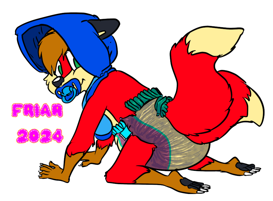 Illustration of Ozzy the wet and messy diapered two tailed fox on his paws and knees wearing a baby bonnet and bib in Friar's nursery. A ring stacking toy and bonnet wearing diapered lion plushie are on the ground in front of the diaper pail and changing table.