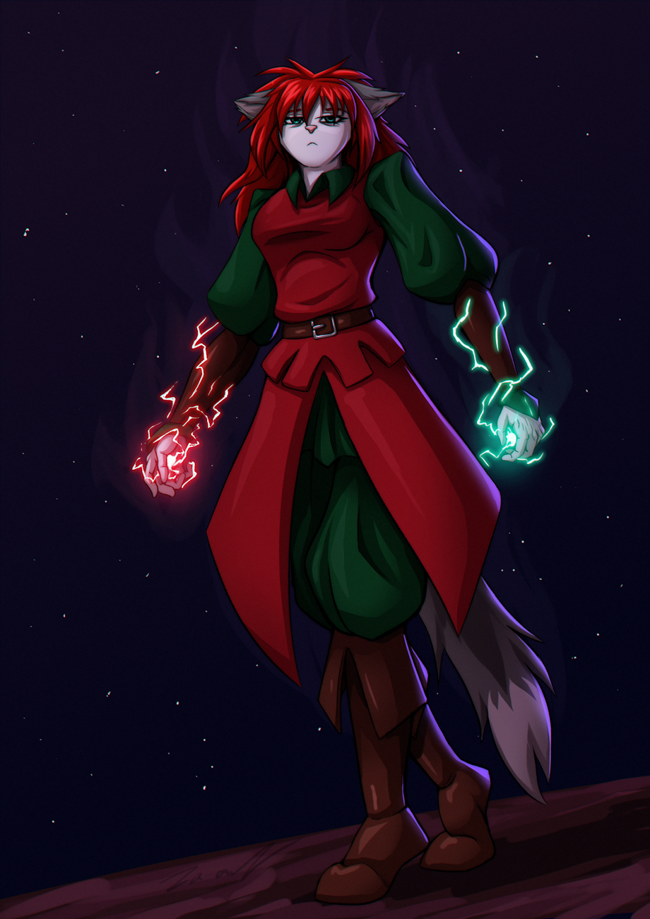 Wyna looking at something in the distance. Her face shows little emotions. Sparks of magic in turquoise blue and red flow and crackle around her hands and forearms. It seems she's planning on something.