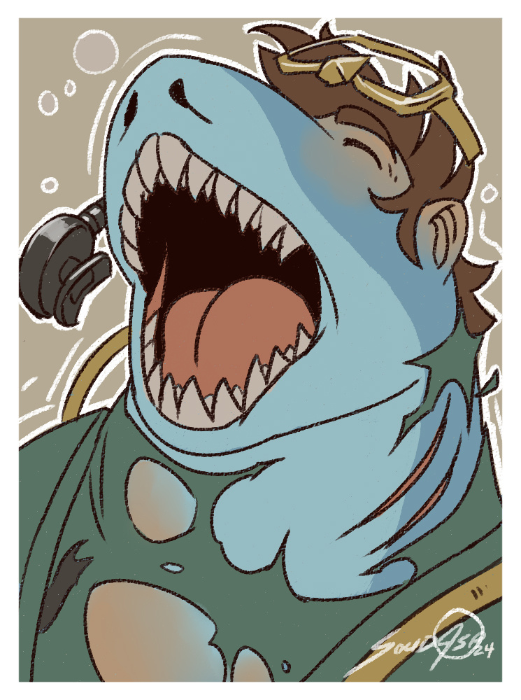 After having discovered some cursed shark teeth a few months ago that turned me and a friend into sharks, I decided to return to diving. I know...I never learn, do I? I guess my body hadn't completely forgotten my tiger shark form, because I began to transform and burst from my SCUBA suit as soon as I hit the water!